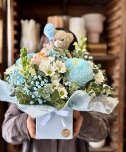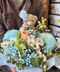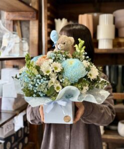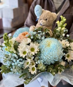 Congratulate friends or loved ones on their new arrival with It’s a Boy! This beautiful blue themed gift features a soft teddy and helium balloon as well as a stunning flower arrangement in a cute box.