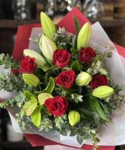 Experience the perfect fusion of romance and sophistication with our red roses and Oriental lily bouquet. Each bloom is carefully selected, creating a mesmerizing arrangement that captures the essence of love. Whether as a gift or for your own enjoyment, this bouquet adds a touch of timeless beauty to any occasion. Delivered in pristine condition, it’s a gesture that speaks volumes. Order now to elevate your floral experience.