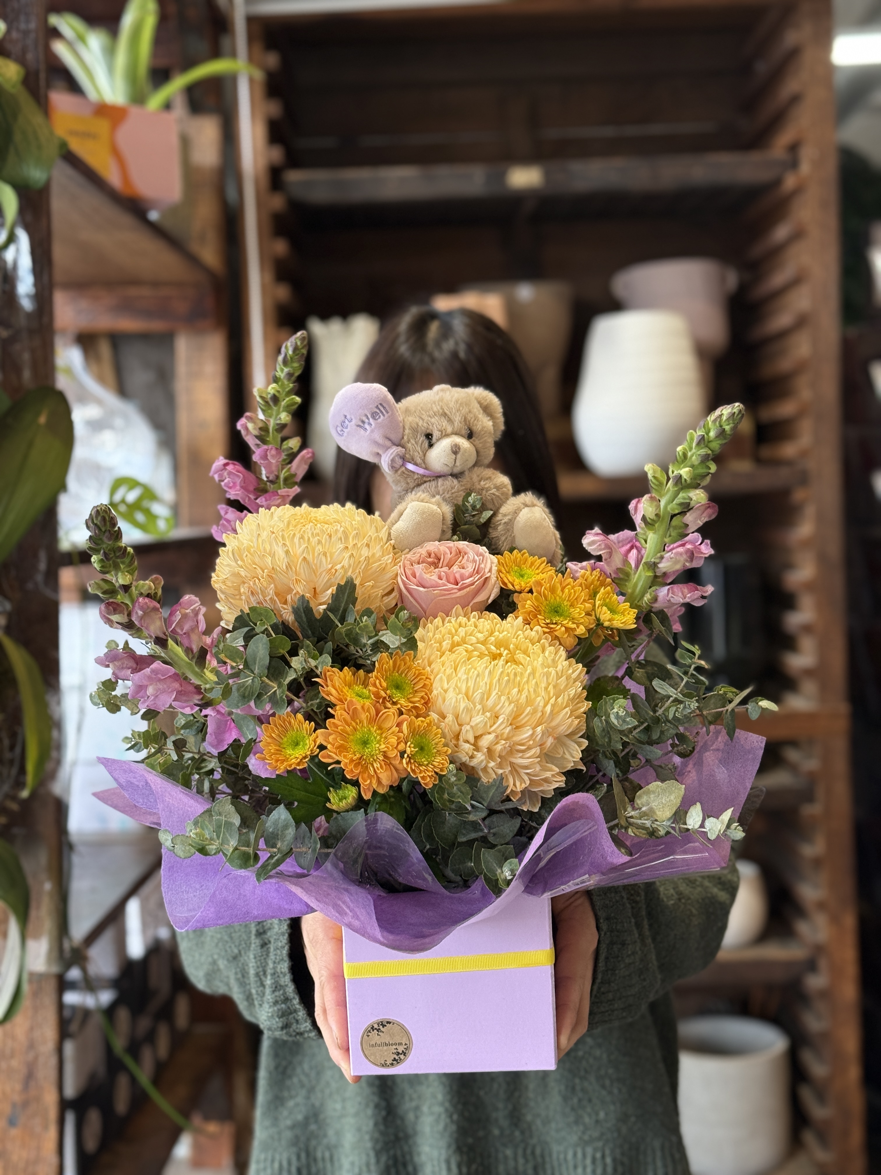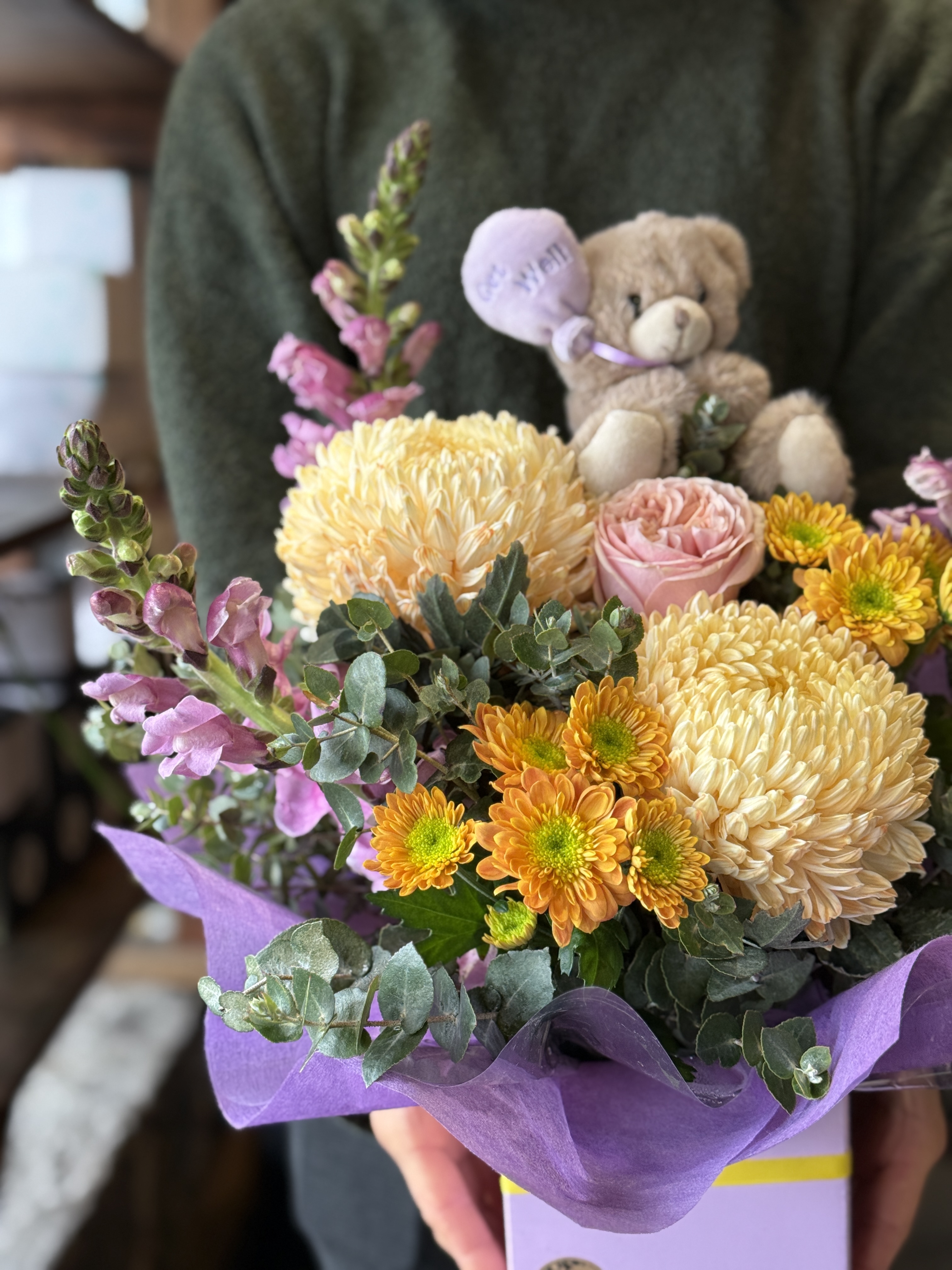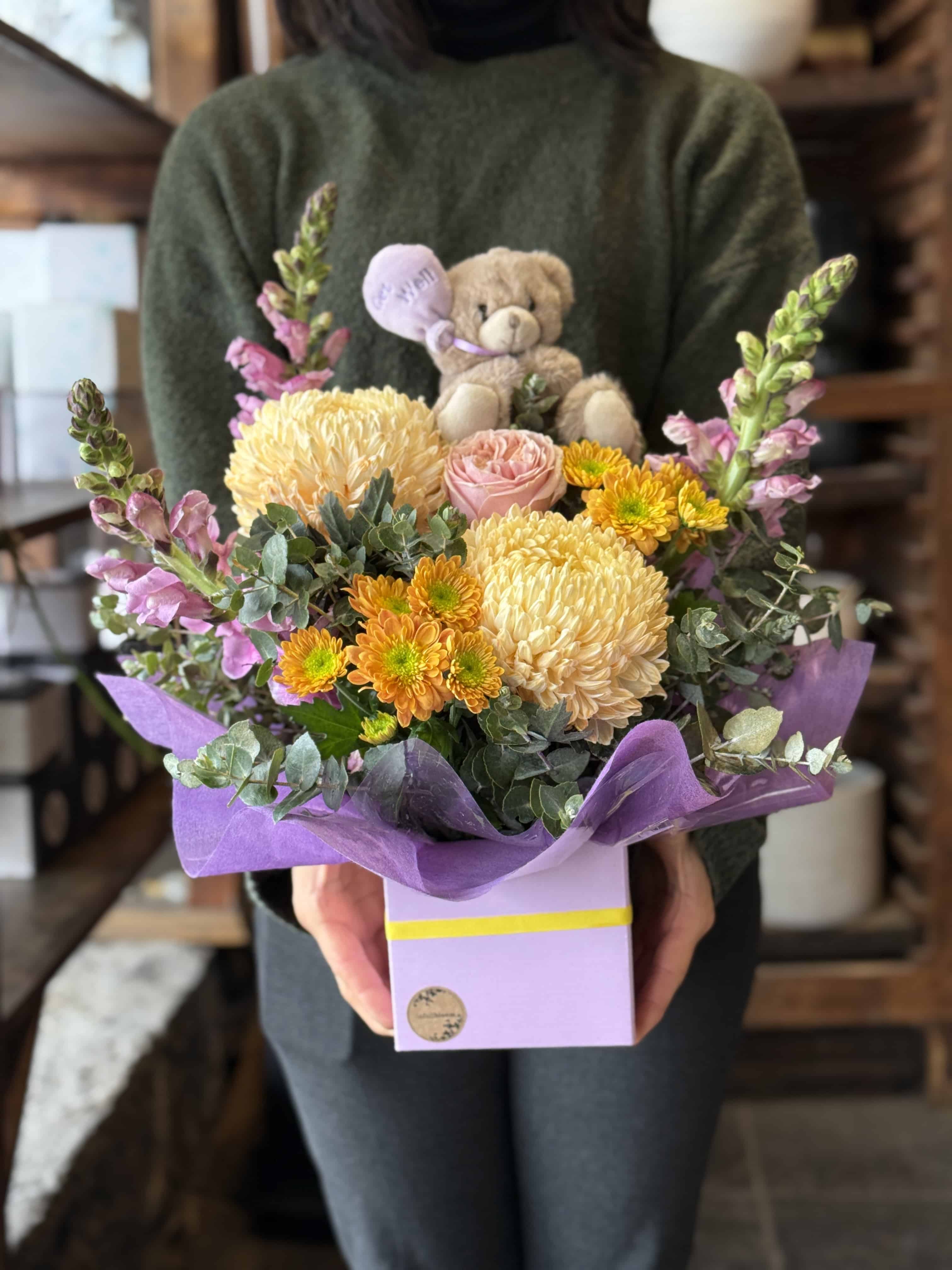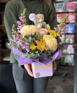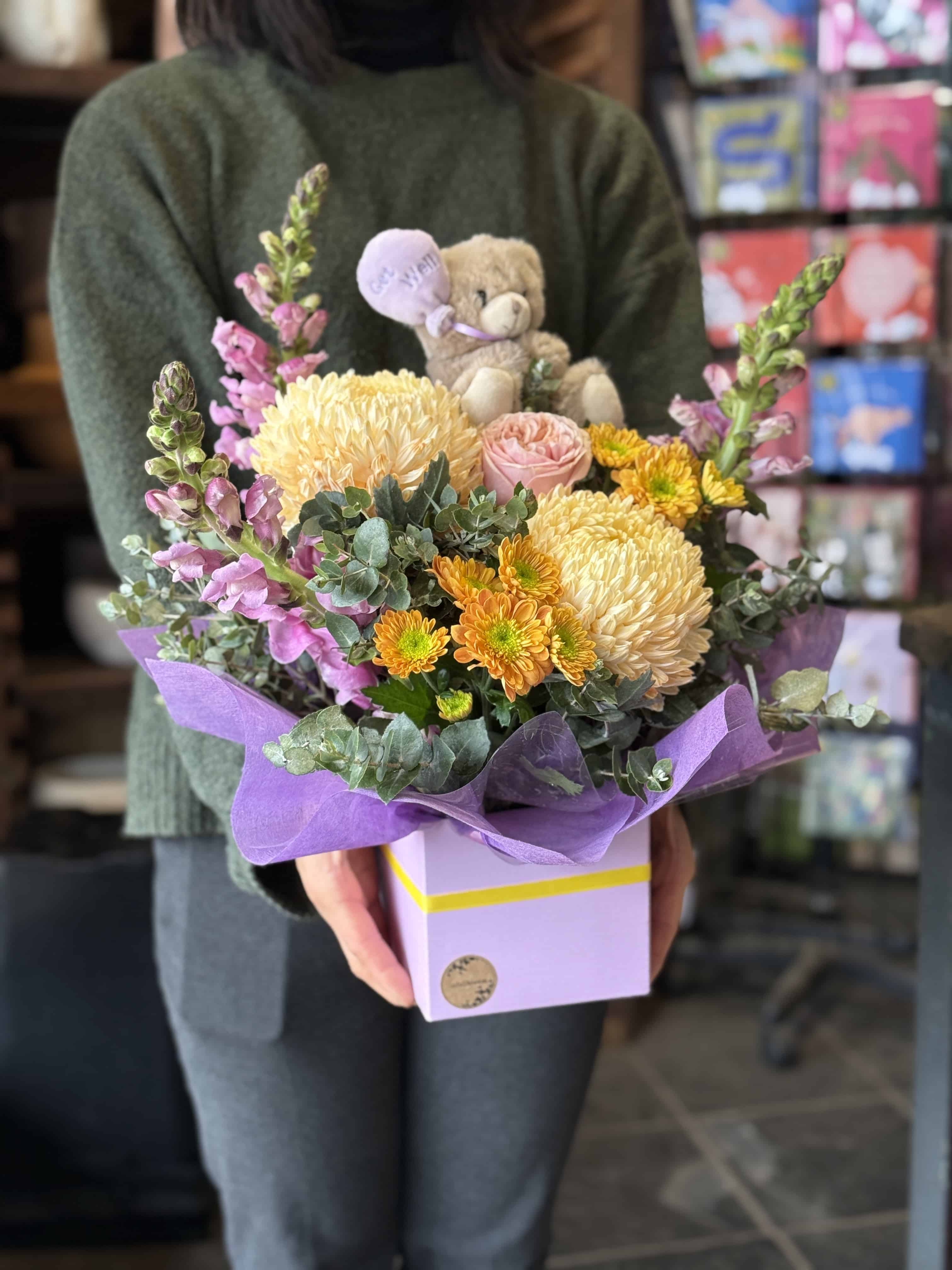 A delightful gift to give to someone who could use a bit of sunshine! A bright mixed arrangement of flowers in a box, accompanied by a teddy, suitable for delivery to a home or hospital.
